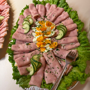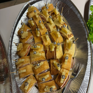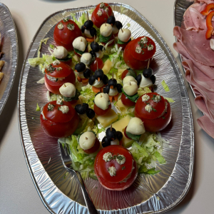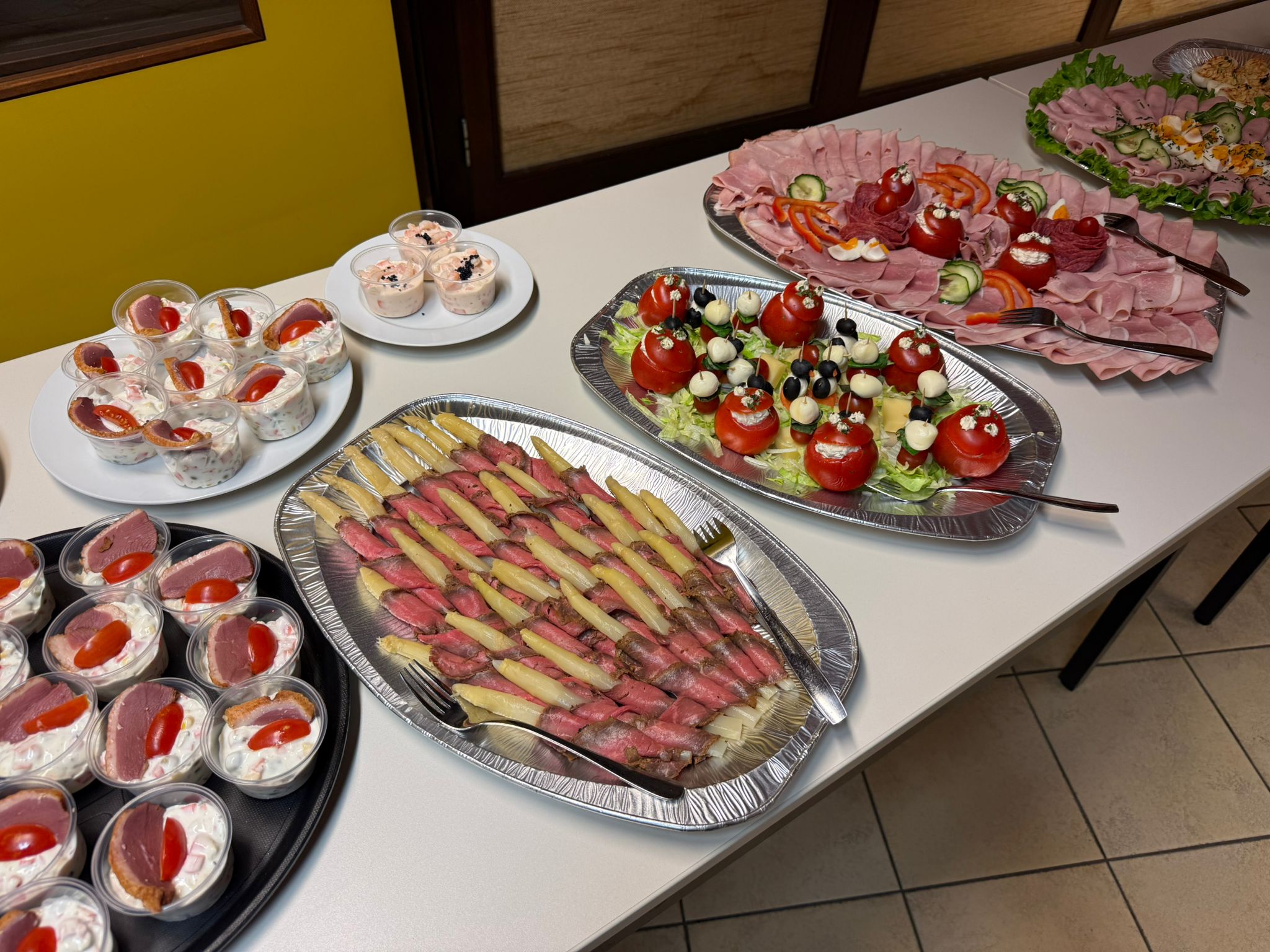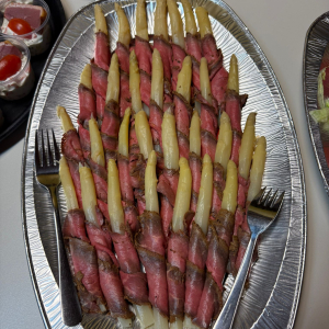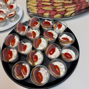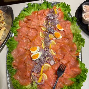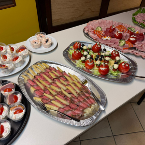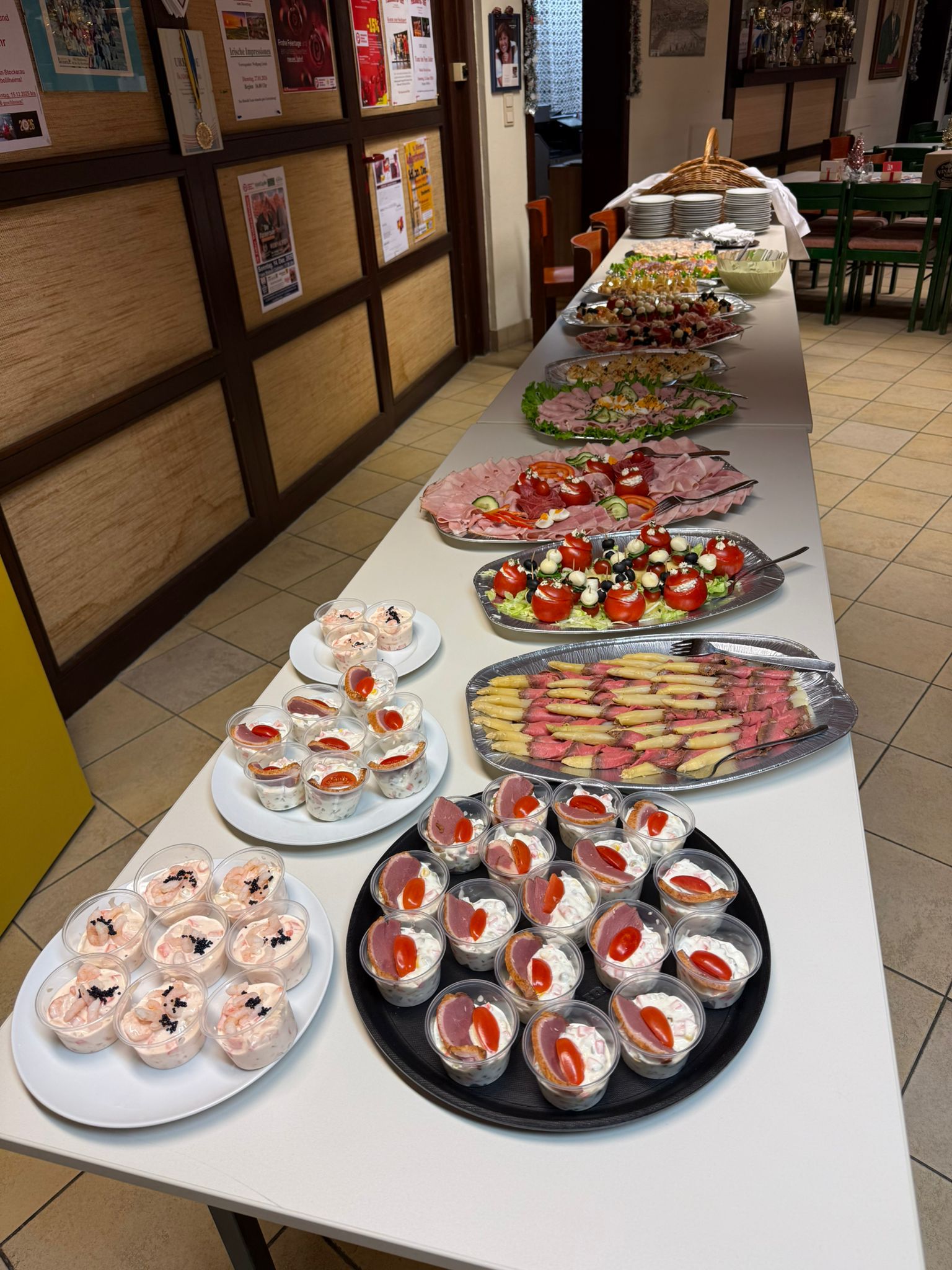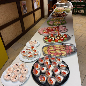 Kaltes Vorspeisenbuffet, Lachsfilet mit Orangensauce und Wildreis, Kalbsgulasch, gemischtes Gebackenes, abgerundet mit Schomlauer Nockerln und musikalischer Schrammel -Begleitung. Schön wars!
