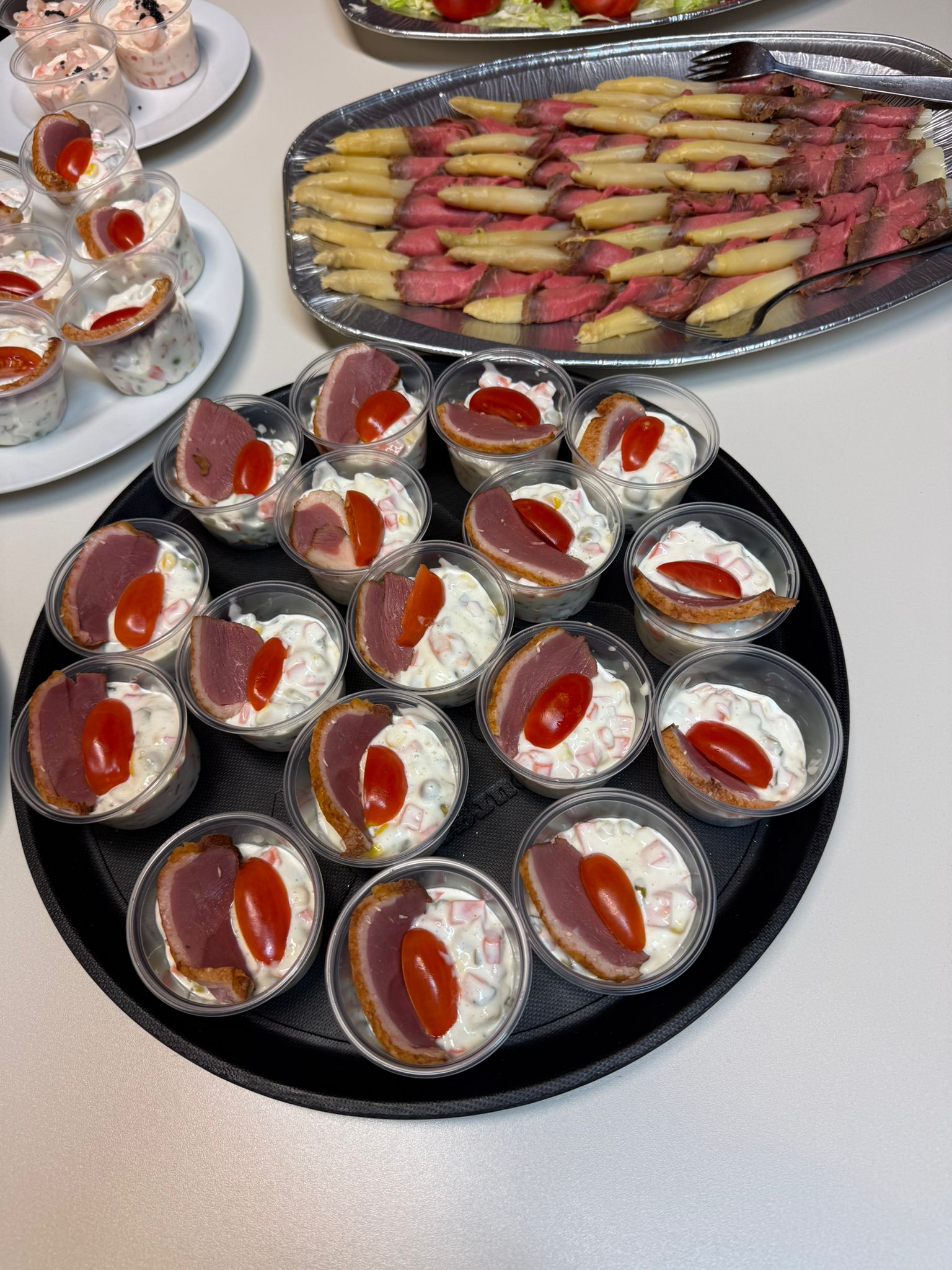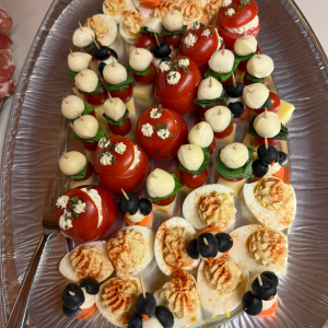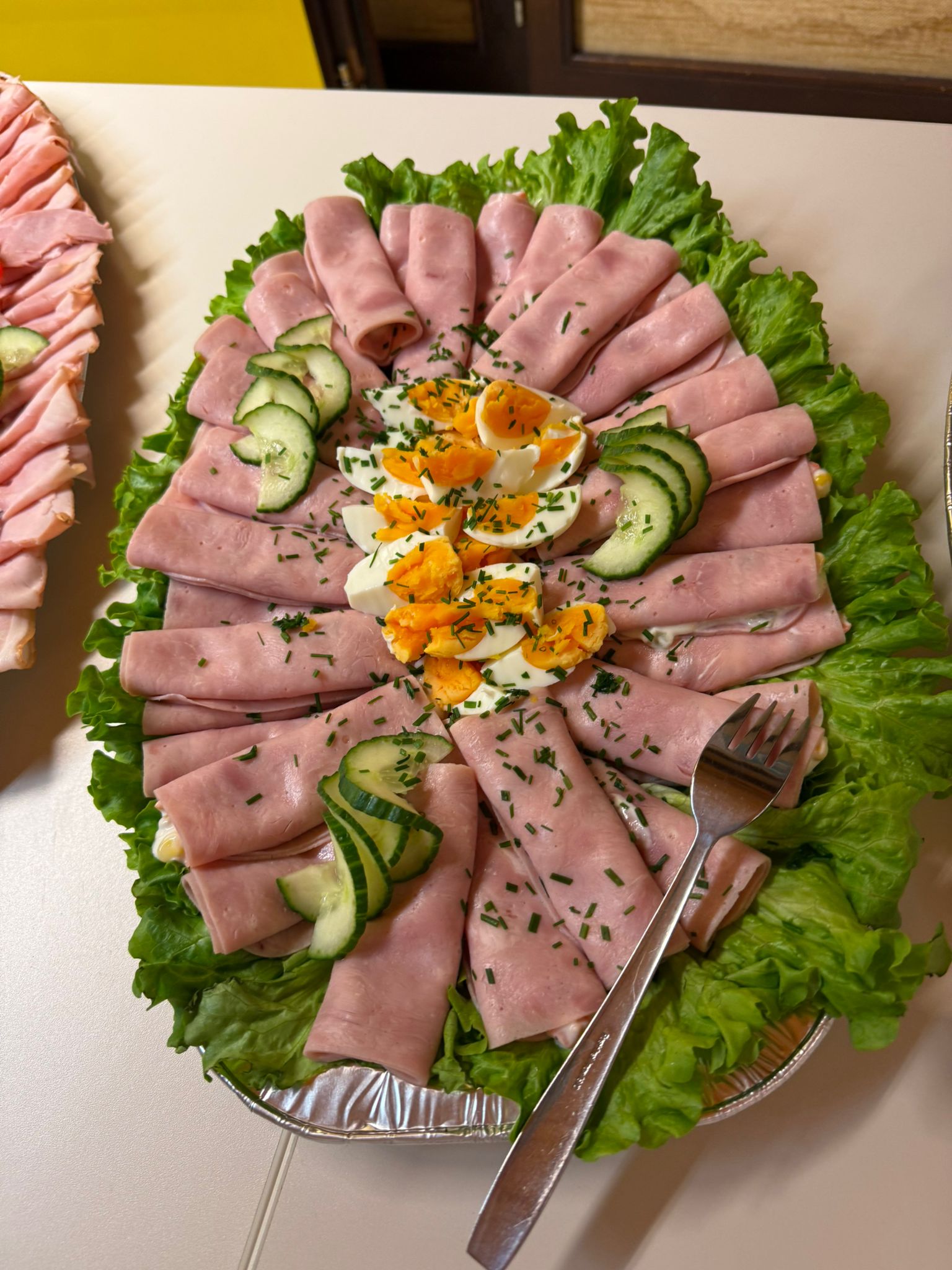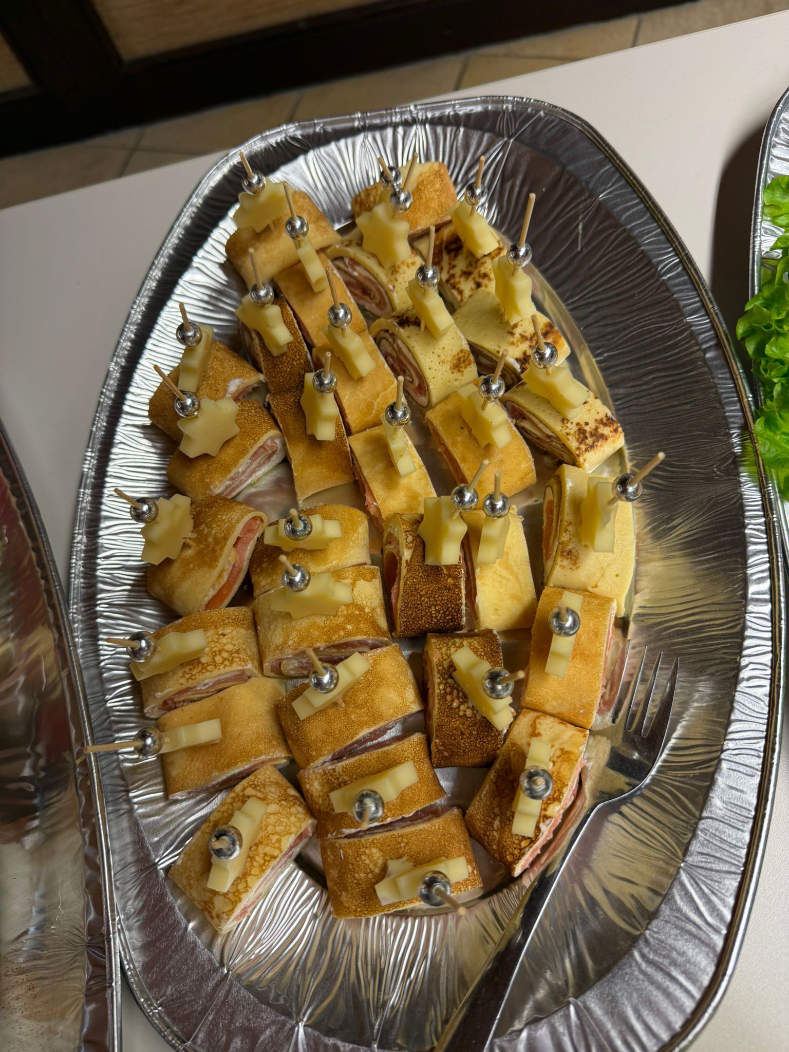 Kaltes Vorspeisenbuffet, Lachsfilet mit Orangensauce und Wildreis, Kalbsgulasch, gemischtes Gebackenes, abgerundet mit Schomlauer Nockerln und musikalischer Schrammel -Begleitung. Schön wars!